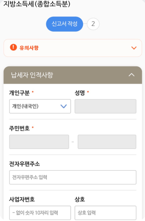 납세자 주민번호 뒷자리를 포함한 인적사항을 입력한 후 신고 버튼을 누르면 완료 됩니다.